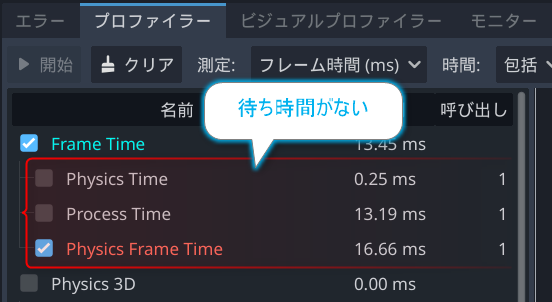 Godotのプロファイラーですが、各項目にかかっている時間はわかるのですが、「待ち時間」が分かりません。
